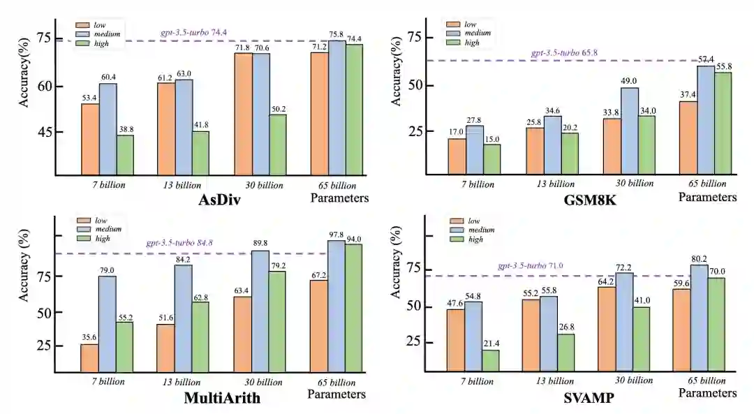 我们观察到,当数据复杂性极高时,语言模型的性能倾向于下降,这反映了大型语言模型的推理能力有其固有的限制。首先,我们认为当前语言模型的架构(例如decoder-only架构)对于理解复杂知识的能力有限,这也限制了其推理能力的涌现。大模型展示强大推理能力的前提是它们能够理解复杂数据中嵌入的结构和逻辑知识。因此,未来的研究需要探索具有更强推理能力的模型基础结构。其次,进一步增强推理能力需要依赖外部工具。我们知道推理问题的范围非常广泛,不仅包括数学推理,还包括常识或更复杂的逻辑推理任务。因此,仅依靠LLM本身是不足以一次性解决所有问题的,需要更强大的外部工具的协助。 2. 不同复杂度分数的数据特征