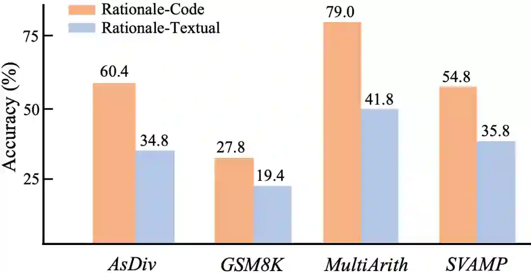 为了验证代码和文本推理链的效果,我们用文本替换了使用相同数据集的代码程序推理过程。代码数据集在所有四个数据集中都展示出明显的优势。这是因为代码本质上包含了逻辑语义和结构信息, 另一个原因是代码可以被外部解释器执行。因此带有代码的提示方法优于扁平化的文本信息。