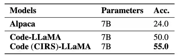 为了验证我们方法在代码相关任务中的有效性,我们过滤训练数据集并获得了更多高质量代码指令的子集。结果表明,Code (CIRS)-LLaMA在纯代码生成任务中表现出有效的性能。我们可以得出结论,优化的结构和逻辑语义对LLM的推理能力最有益。