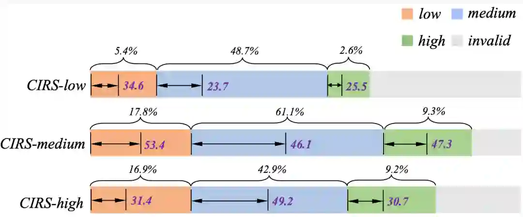 为了尽量避免现有数据集本身造成的误差,我们选择模拟新的代码数据,种子数据的来源包括GSM8K、MultiArith、Asdiv等训练集。我们从五个种子数据集模拟合成了超过60,000个样本。最后每个数据集生成了大约10,000个样本,并且我们选择尽可能多的数据集以确保数学问题的多样性。在获取到生成的代码数据后,我们使用CIRS指标并根据代码复杂性分布的分析手动将数据分成不同的子集。基于不同的复杂性分数,我们将划分的子集命名为low(低分样本)、medium(中分样本)和high(高分样本)。