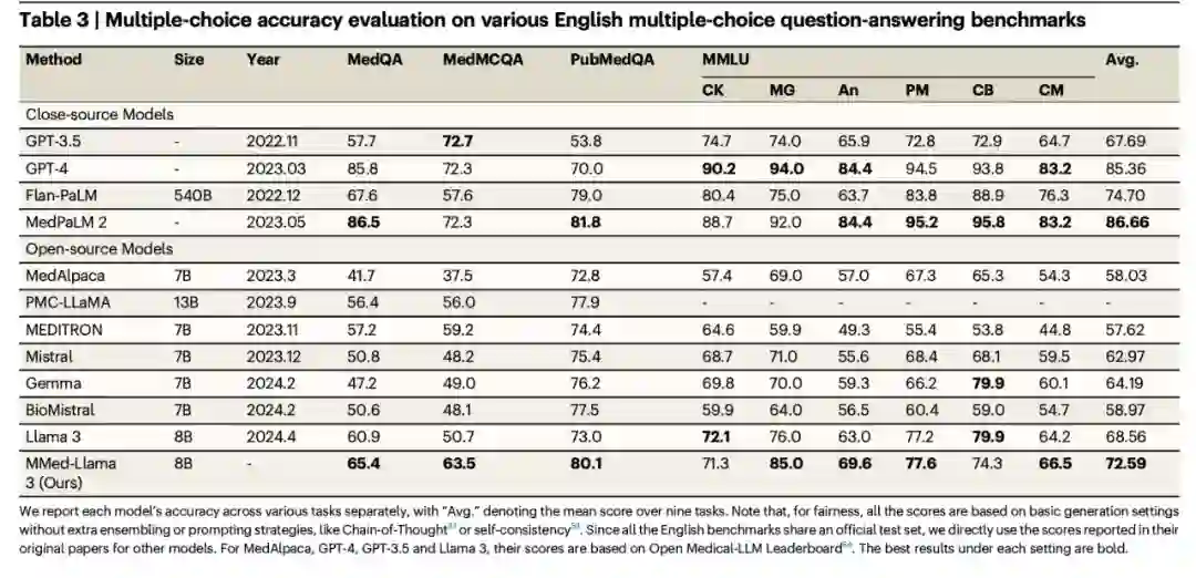 英语多项选择题答题基准的准确率评估。报告了每个模型在不同任务中的准确率,“Avg. ” 表示九个任务的平均得分。请注意,为公平起见,所有分数都是基于基本的 zero-shot 生成设置,没有额外的提示策略。由于英文基准已被广泛得应用,因此直接使用其原始论文中报告的分数。对于 MedAlpaca、GPT-4、GPT-3.5 和 Llama 3,它们的分数基于 Open Medical-LLM 排行榜。