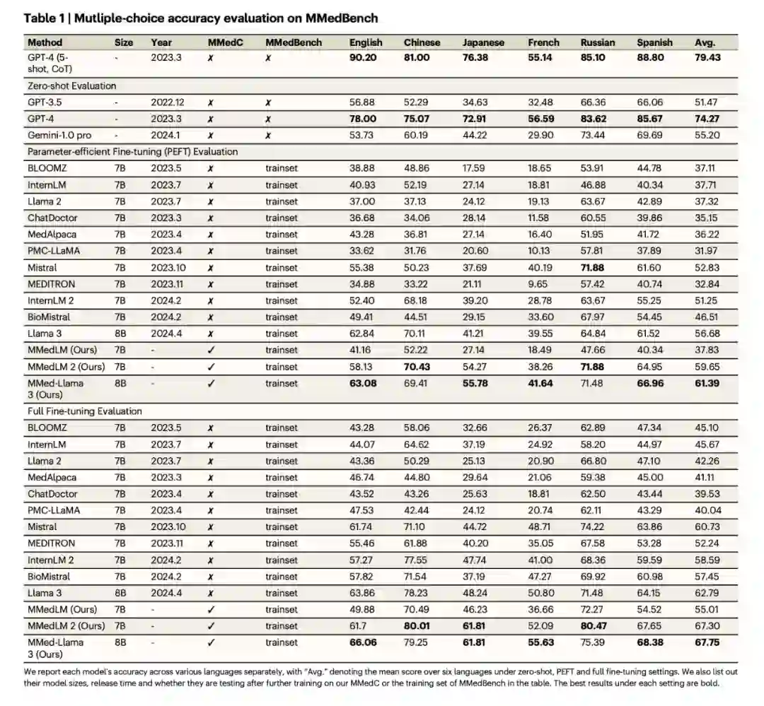 为了评估医学领域多语言模型的发展,研究团队设计了一项全新的多语言选择题问答评测标准,命名为 MMedBench。此基准测试的所有问题均直接源自各国的医学考试题库,而非简单地通过翻译获得,避免了由于不同国家医疗实践指南差异导致的诊断理解偏差。