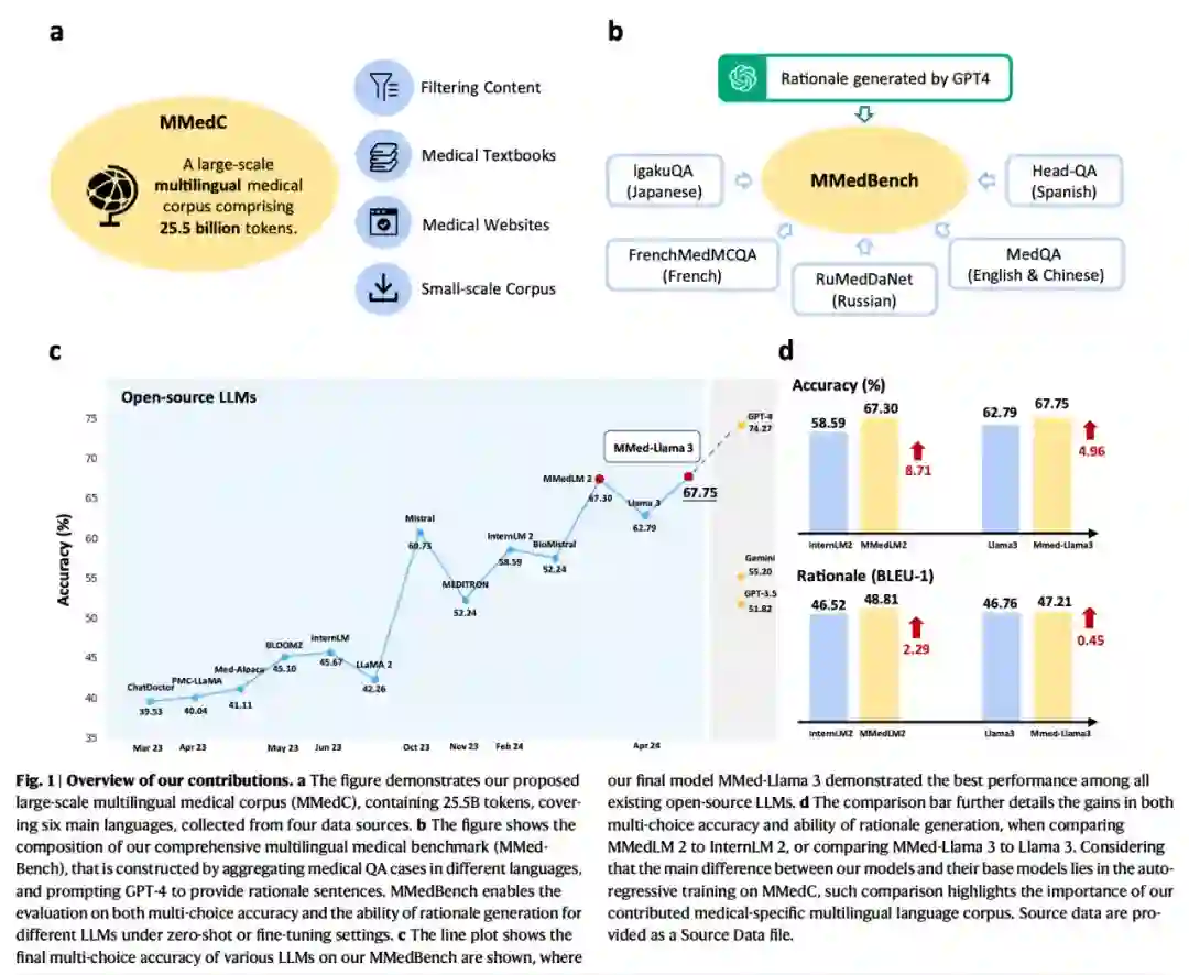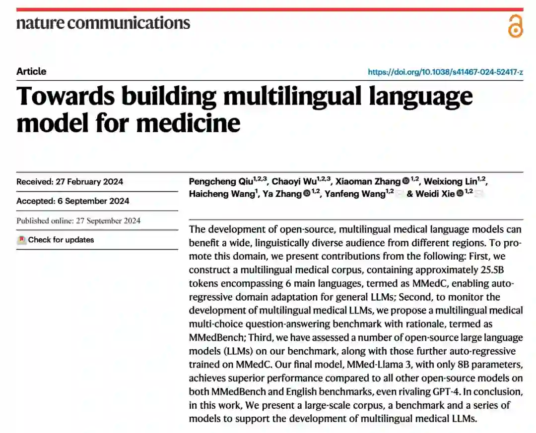 为了克服这一挑战,近期一篇发表在《nature communications》的论文全面地从数据、测评、模型多个角度考虑了多语言医学大语言模型的构建,做出了三项贡献: