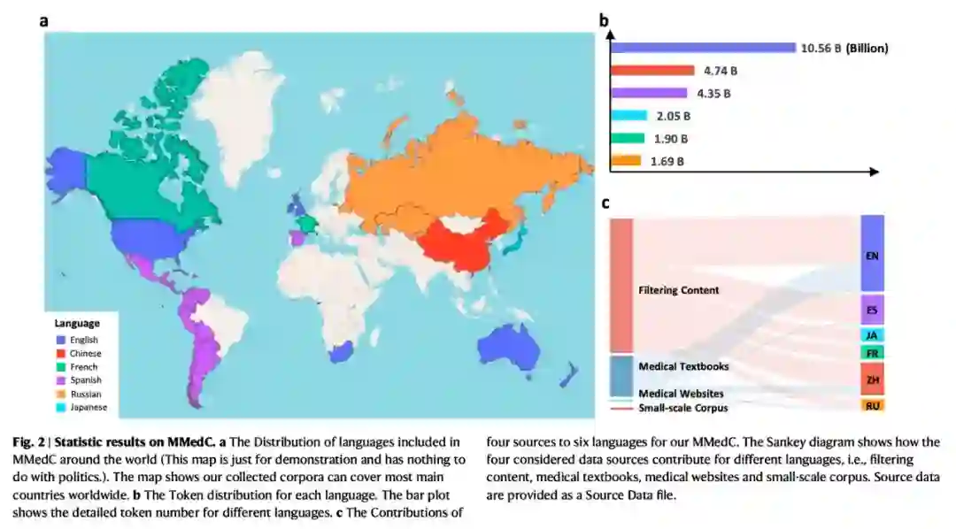 MMedC 数据集统计概览。图 a 展示了该语料库覆盖的语言对应的地域;图 b 提供了各种语言的详细数据量统计;图 c 深入呈现了每种语言数据的来源分布比例。