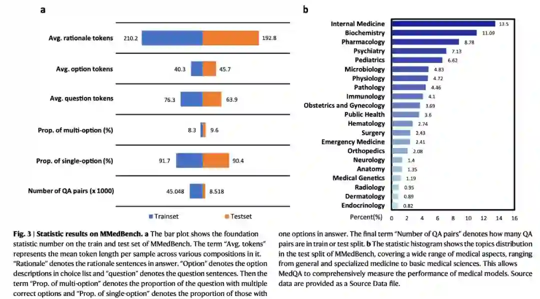 MMedBench 数据统计。图 a 呈现了 MMedBench 训练集与测试集的基础数值统计信息;图 b 揭示了 MMedBench 样本在不同主题上的分布情况。