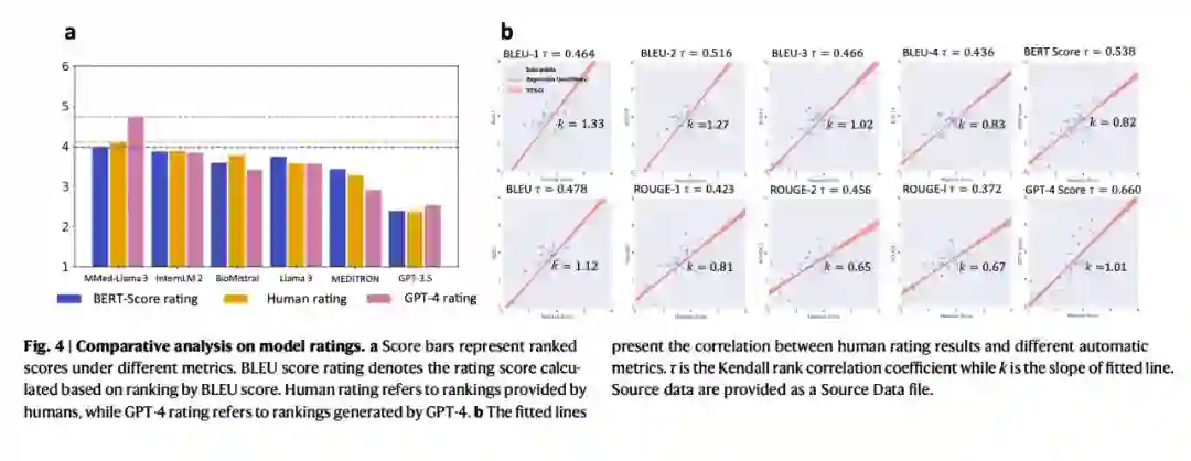 模型打分结果对比分析。图 a 展示了按照 BLEU 分数、人工质量排序和 GPT-4 质量排序的量化分数。图 B 展示了自动指标和人类评估之间的相关性,其中 k 代表拟合直线的斜率,t 代表坎德尔相关系数。