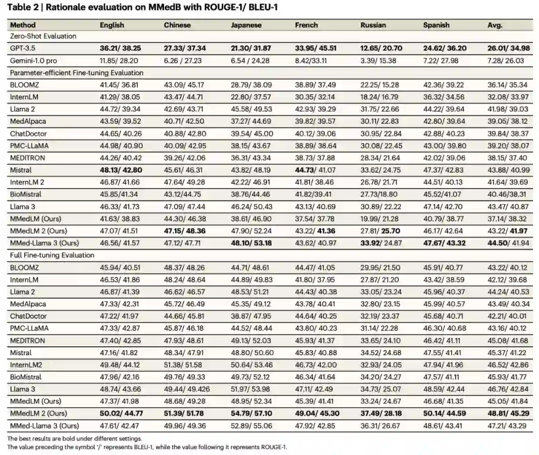 主流模型在 MMedBench 上的准确率评测。其中 “MMedC” 标志着模型是否在 MMedC 语料库上完成进一步预训练,“MMedBench” 则标志着模型是否在 MMedBench 的训练集上完成微调。需要注意的是,English,Chinese,Spanish 是四选一选择题,Russian 是二选一选择题,French,Japanese 是不定项选择题。只有模型输出完全正确时,才会被视为正样本。“Avg.” 代表这六种语言的平均准确率。