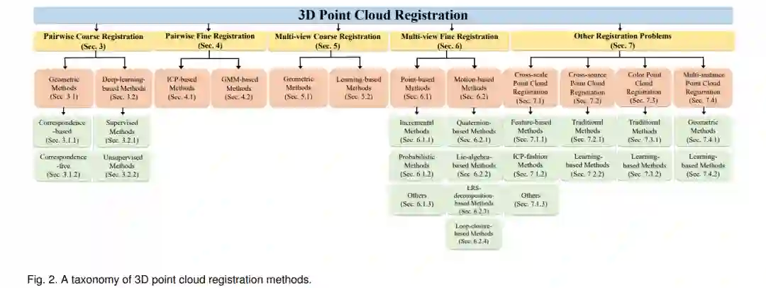 本文的其余部分安排如下:第二节回顾了点云配准的数据集和评估指标;第三节介绍了配对粗配准方法,包括基于对应和无对应的方法;第四节讨论了配对精细配准方法,重点介绍了基于ICP和GMM的方法;第五节介绍了多视角粗配准方法,包括几何方法和基于深度学习的方法;第六节介绍了多视角精细配准方法,包括基于点的和基于运动的方法;第七节介绍了其他配准问题,如跨尺度、跨源、彩色点云和多实例配准;第八节讨论了该领域的挑战与机会。最后,第九节总结了全文。