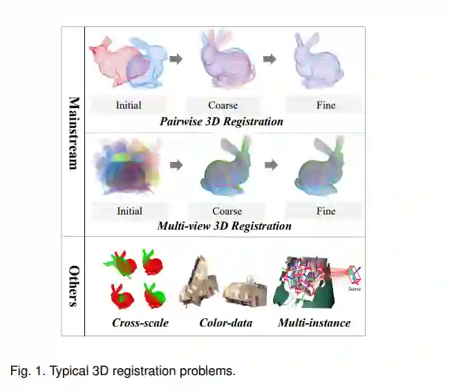 对三维点云进行统一坐标系配准(即三维点云配准)是计算机视觉、计算机图形学、机器人学、遥感等多个领域中的一个基础问题。配准后的点云可以带来两个关键结果:1)提供更完整的点云用于重建、信息融合和误差测量;2)为鲁棒的姿态估计、三维跟踪、物体/地点定位和运动流估计提供六自由度(6-DoF)姿态。随着三维主动和被动获取技术的发展(如英特尔的RealSense、苹果的iPhone系列),三维点云配准在过去三十年中引起了越来越多的研究关注。 特别地,针对鲁棒的三维点云配准,已经根据数据获取方式或应用场景的不同,衍生出多个子领域(见图1)。从处理的数据序列的角度看,配对配准主要关注对齐两组点云,而多视角配准则处理多个顺序或无序的点云。从误差最小化的角度看,粗配准大致对齐具有较大姿态变化的点云,而精细配准通常聚焦于最小化较小的残差误差。从方法学的角度看,早期的方法设计了手工优化或启发式方法,而近年来的方法则依赖于深度学习技术。还有一些其他的研究视角,如特征学习、对应学习和鲁棒的6-DoF姿态估计。因此,三维点云配准领域涉及了大量的方法和研究主题。 现有的综述通常聚焦于点云配准任务的不同部分或有限范围。例如,早期的综述[1]涵盖了点云配准的多个方面,但缺乏对各子领域之间内在关系的深入分析,未能系统地揭示它们之间的相互联系和互动。最近的综述[2]回顾了常用的数据集和评估指标,但缺乏在统一实验设置下的性能比较,未能展示不同方法在一致条件下的优缺点。因此,这些综述未能从更加全面的视角覆盖过去三十年的文献。 为填补这一空白,我们在本文中提供了对过去几十年三维配准方法的全面综述。主要贡献如下: