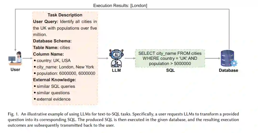 引言 SQL查询的利用显著提高了从多个数据库中提取数据的效率。这些数据已被有效应用于多个重要领域,如商业智能 [80] 和医疗分析 [78]。虽然技术专业人员擅长处理SQL查询,但数据库的自然语言接口(NLIDB)使得非技术用户也能够无缝地从结构化数据库中提取信息 [20]。这种便捷性显著推动了文本到SQL系统的发展,这些系统能够自动将自然语言(NL)查询转换为有效的SQL查询。为了说明这一点,我们考虑一个简单的数据库,如图1所示,包含一个名为“cities”的表格,表中有“country”、“city_name”和“population”三列。通过使用文本到SQL系统,用户输入类似“Identify all cities in the UK with populations over five million”的查询,将其转换为以下SQL查询:“SELECT city_name FROM cities WHERE country = ‘UK’ AND population > 5000000”。生成的SQL查询随后在给定数据库中执行,返回的结果(如“[London]”)将反馈给用户。整个过程简化了不熟悉SQL的用户对信息的访问。
