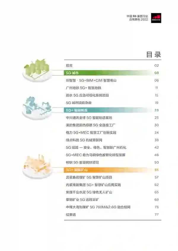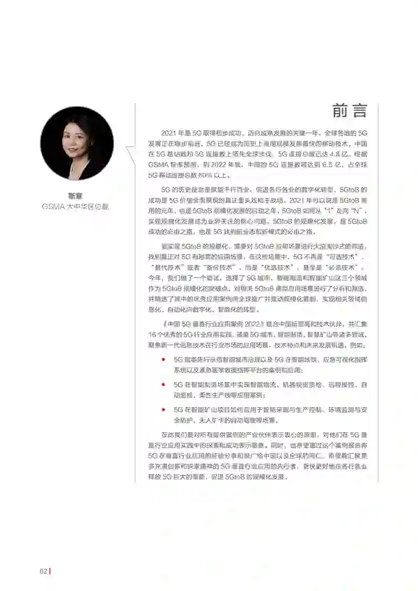 2021年是5G取得初步成功、迈向成熟发展的关键一年。全球各地的5G发展正在稳步前进,5G已经成为历史上商用规模发展最快的移动技术。中国在5G基站数和5G连接数上领先全球步伐,5G连接总数已达4.8亿。根据GSMA智库预测,到2022年底,中国的5G连接数将达到6.5亿,占全球5G移动连接总数60%以上。 《中国5G垂直行业应用案例2022》联合中国运营商和技术伙伴,共汇集16个优秀的5G行业应用实践,涵盖5G城市、智能制造、智慧矿山等诸多领域,聚焦新一代信息技术在行业市场的应用场景、技术特点和未来发展机遇,例如: * 5G赋能先行示范智能城市治理以及5G在智能地铁、应急可视化指挥系统以及紧急医学救援指挥平台的案例和应用;