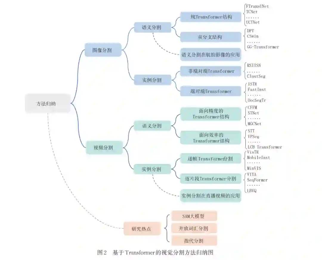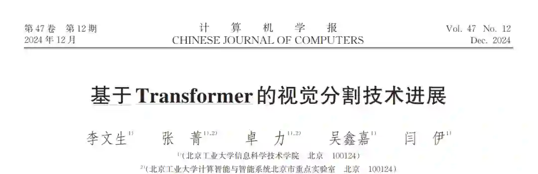 摘 要 视觉分割是计算机视觉领域的核心任务,旨在将图像或视频帧中的像素分类以划分成不同区域 .得益于 视觉分割技术的快速发展,该技术在自动驾驶、航空遥感和视频场景理解等多种应用领域中发挥着关键作用.近年 来,基于 Transformer的视觉分割技术因具备长程依赖建模能力而备受关注 .随着 Transformer的模型架构的持续 优化与迭代,亟须更全面地理解和认识Transformer在视觉分割领域的已有进展和发展趋势,通过发现现有研究中 的不足和挑战,以更深入地探索 Transformer的核心理论 .为此,本文从图像/视频两个视觉脉络出发,整理、回顾、 分析和探讨了近年来基于 Transformer的视觉分割相关技术进展,不仅归纳了 Transformer的理论框架,还给出了 一些应用实例和研究热点,从而做出总结和展望 .具体来说,首先梳理了 Transformer的背景,包括问题定义、数据 集和评估指标、基本结构,其中,问题定义描述了视觉分割在图像/视频任务中的预期目标和结果;数据集和评估指 标反映了模型的具体应用场景,以及性能的衡量标准;基本结构则描述了算法的核心模块、实现流程以及各个模块 之间的关系.然后,着重阐述了Transformer在图像语义分割、图像实例分割,以及视频语义分割和视频实例分割四 个方法体系,并探讨了当前的研究热点.对于图像语义分割任务,分析了Transformer的代表性结构,包括纯Trans⁃ former和双分支结构,并以无人机影像非铺装道路分割和遥感图像语义分割为实际应用案例,探讨了Transformer 的改进动机与应用效果,并展示了主观结果;图像实例分割总结了常见的非端对端 Transformer 和端对端 Trans⁃ former典型结构.视频语义分割主要分为面向精度的和面向效率的Transformer结构,视频实例分割则包括逐帧和 逐片段 Transformer 分割,并以网络直播视频实例分割为应用实例,一方面讨论了可用的数据集、实验参数和评 估指标,另一方面,对网络直播视频实例分割主流方法性能进行了评价和分析,展示了一些主观可视化结果 . 之 后,鉴于视觉分割领域的 SAM 大模型、开放词汇分割、指代分割受到了广泛关注,本文将这些热点问题方法进行 了追溯和评述,以期碰撞出视觉分割的新思路和新灵感 . 最后,尽管基于 Transformer 在视觉分割技术受到了广 泛的关注,但存在的科学问题也逐渐凸显,限制了模型性能与效率的进一步提升,对此本文总结了利用 Trans⁃ former开展图像/视频语义/实例分割仍需关注的难点问题,并对未来可能的发展方向进行了展望,提供了一些启 示供参考 . 关键词 视觉分割;Transformer;语义分割;实例分割;自注意力机制