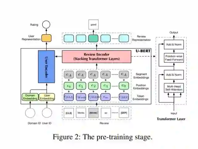 用户表示的学习是推荐系统模型中的重要一环。早期的方法根据用户和项目之间的交互矩阵来学习用户表达,但这些交互矩阵非常稀疏且矩阵中的值通常是粗粒度的,导致系统很难学习到准确的用户表达。近期一些工作利用信息更加丰富的评论文本来增强用户的表示学习,但对于冷门的领域或场景,评论文本的数量也不足以帮助其学习到完整准确的用户表示。用户的一些偏好(如评论习惯等)是在不同的领域或场景间共享的,我们可以利用数据丰富的场景下的评论帮助数据不丰富的场景的推荐。同时,受到近期自然语言处理领域中预训练技术的启发,本论文提出了一种基于预训练和微调的两阶段推荐模型。如图(a)所示,U-BERT包含两个主要模块能够建模评论文本并将其语义信息和用户的嵌入表达进行融合。在预训练阶段,我们设计了两种新的预训练任务能够充分地利用不同场景下积累的评论文本来学习通用的用户表达。如图(b)所示,在微调阶段,我们会根据特定场景下的评论数据对预训练的用户表示进行微调以适应当前场景下的特点。此外,在进行评分预测时,我们还设计了一个co-matching模块以捕捉细粒度的语义匹配信息来更好地预测用户对项目的打分。实验结果表明,本文提出的推荐模型在多个开放数据集上取得了性能提升。