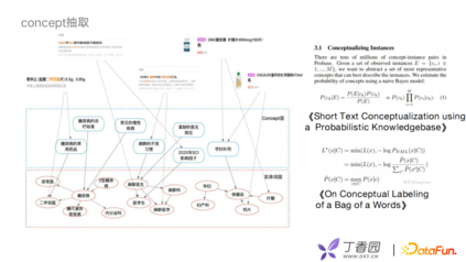 利用concept层次联合底层的专业医学实体和上层的业务,构建一个完整的业务图谱。以贝叶斯模型为基础去判断一对一的边关系,考虑全局的统计量或者文本的局部特征,生成一些多边的关系。我们借鉴了王仲远老师的一些相关工作,如MDL的原则等去做concept筛选。例如,论坛帖子、药物、商品信息等可以通过中间的concept层与实体之间进行关联。