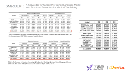 SMedBERT优化方向主要有两个,第一个考虑实体类别和关系来丰富语义, 第二个是构建knowledge bridge,将有一跳连接关系的邻居实体加入预训练模型中。