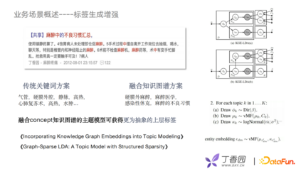 我们利用concept结构图谱对文本结构化上做了一些提升。文本结构化对于提升搜索效果起到了非常重要的作用,有了concept之后可以帮助我们从抽象的层面完成对文本打标签的工作,那业界中比较好的方案就是先用TransE之类的知识表示模型,把知识图谱train出Embedding,然后将这些embedding融合进LDA的模型里面,在模型中,会用vMF分布代替原来的高斯分布去处理实体词的部分。如此以来,我们就会对一篇如“麻醉不良习惯”的帖子中的讨论帖子抽出如“麻醉医学”和“麻醉的不良习惯”这样的关键词。
