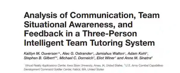 这项研究评估了与智能团队辅导系统(ITTS)一起工作的三人小组在虚拟军事监视任务中的表现和团队技能如何受到反馈隐私、参与者角色、任务经验、先前团队经验和队友熟悉程度的影响。智能辅导系统(ITSs)以前的工作主要集中在个人学习者的任务技能训练结果上。随着研究扩展到团队的智能辅导,任务技能和团队技能对于良好的团队表现都是必要的。这项工作包括对以前关于ITTSs、反馈、团队和团队工作的研究的简要回顾,包括叙述与本研究相关的团队工作表现框架的两个类别,即沟通和认知。这项研究考察了智能Agent以及团队、其成员和正在进行的任务特点对团队沟通(通过相关按键测量)和团队态势感知(通过测验分数测量)的影响。三十七个由三名参与者组成的团队,每个人都在自己的电脑上运行一个多人监控模拟,在四个5分钟的试验中,他们得到了及时的私人(个人交付)或公共(团队交付)的性能反馈。在第四次试验中,三名参与者中的两名交换了角色。反馈类型、团队工作经验和队友熟悉程度对沟通或团队态势感知没有统计学上的显著影响。然而,较高的角色经验和任务经验对沟通表现有明显的、中等规模的影响。基于表现数据和结构化访谈回答的结果还揭示了未来反馈设计中需要改进的地方,以及基于行动导向严肃游戏的ITTS中反馈频率的潜在基准。在结论中,提出六个未来ITTS的设计目标,为未来设计有效的ITTS的研究奠定了基础,这些ITTS可以训练新生团队的人际交往能力。