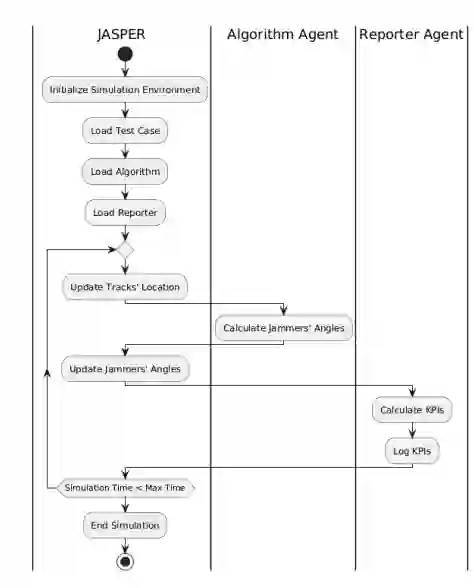 本文提出名为JASPER(干扰器分配仿真评估报告平台)的仿真方法,用于测试评估反无人机系统中的专用威胁评估与武器分配(TEWA)算法。这些算法专注于为威胁覆盖优化分配干扰器角度。不同算法在目标优先级设定、计算时长及设备交互方式上存在差异。为确定更适用算法及其效能,需进行额外测试。本研究旨在开发模块化、基于代理的测试平台以满足该需求。算法测试平台采用基于代理的仿真框架MASON搭建。MASON作为复杂系统仿真平台具备高度可定制性,基于代理的仿真方法使各代理按自有规则运行,提供更真实灵活的仿真环境。本测试平台设计用于报告特定算法在多样化场景下的性能。在此模块化测试环境中,用户可自定义测试案例及需报告的关键性能指标(KPI),支持基于不同场景的深度性能分析。这对理解算法在真实环境中的预期表现尤为重要。