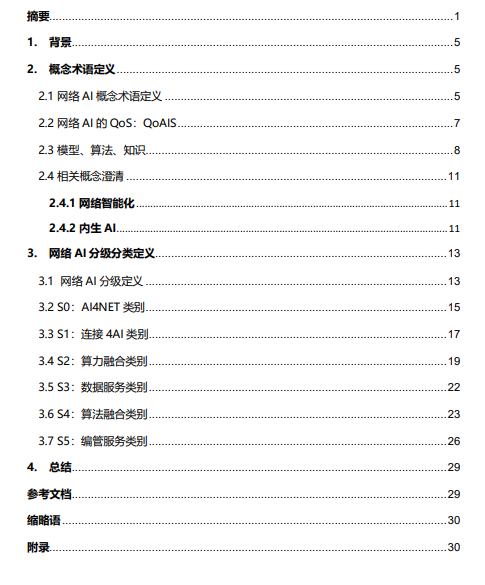 本白皮书介绍网络 AI 相关概念术语定义,并从需求角度,进一步分析 6G 网络和计算、数 据、AI 融合的不同选项,及网络 AI 潜在带来的如 AIaaS 这样的新服务。通过澄清网络 AI 基础概念,定义术语及潜在的各类融合选项,支撑 6GANA 各工作组更高效的讨论网络 AI 场景需求、架构、算法、管控系统等,加速共识的达成。