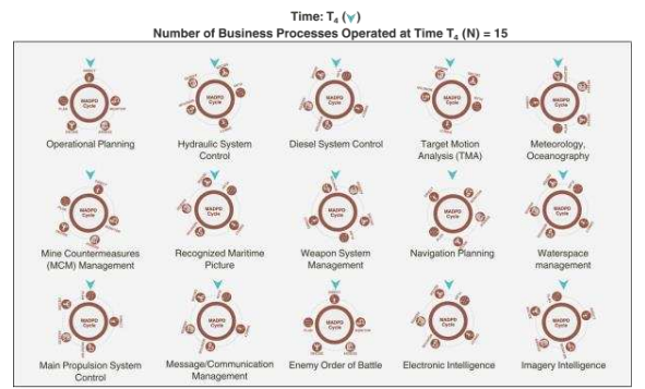 潜艇的组织结构根据技术系统和人员的“功能区域”构建。尽管各国间可能存在细微差异,但潜艇组织中的功能区域通常体现为五个主要领域。这些领域被称为“作战与武器”、“情报”、“技术”、“后勤”和“人员”,人员利用系统时遵循为潜艇这些功能区域预定义的“标准业务流程”。潜艇从事从部署前准备到部署后活动的众多业务流程;使其动态化并成为作战的组成部分。(图3)