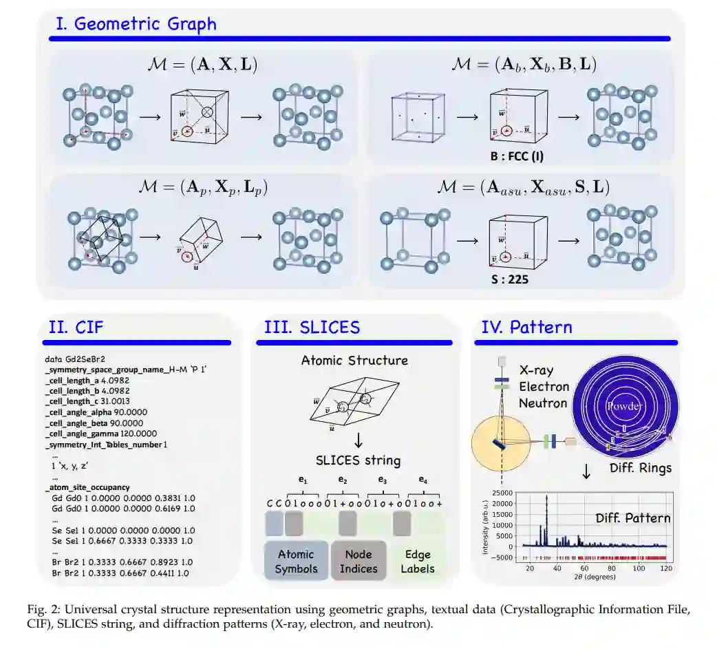 然而,尽管研究进展显著,该领域仍缺乏系统性综述,尤其是在表示方法多样、生成机制复杂、数据来源分散的背景下,研究者难以全面掌握当前发展现状。为此,本文旨在全面回顾“人工智能时代的材料生成”领域的研究现状。 我们首先总结材料的多种表示方式,包括几何图结构、文本序列、SLICES字符串和衍射图样;同时介绍晶体材料所具有的几何对称性与变换属性。随后,我们对现有主流生成方法(包括基于VAE、GAN、扩散模型以及自回归模型的方法)进行分类与技术演进梳理,介绍核心算法与当前最先进模型。此外,我们整理了常用数据集与评估指标,并探讨未来研究方向与存在的挑战。 本文的主要贡献如下: * 材料表示的详细归纳:系统介绍晶体结构的常见表示方法,并提供相应的数学定义。 * 生成技术的系统分类:全面归纳、比较现有主流材料生成方法,并提供发展时间线。 * 丰富的资源汇总:提供大量开源代码与数据集链接,方便读者快速获取并复现。 * 未来发展与挑战分析:总结该领域的未来研究方向和亟待解决的问题,激励学术界进一步创新。