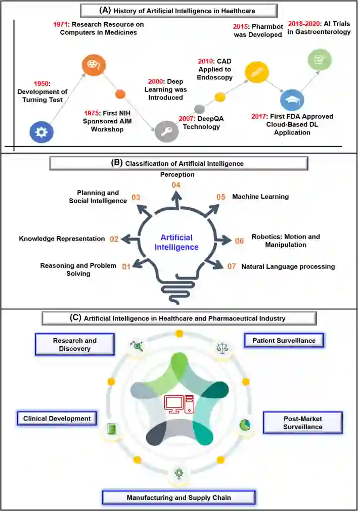 药物设计和开发是制药公司和化学科学家的一个重要研究领域。然而,低疗效、脱靶给药、耗时和高成本是影响药物设计和发现的障碍和挑战。此外,来自基因组学、蛋白质组学、微阵列数据和临床试验的复杂大数据也给药物发现带来了障碍。人工智能和机器学习技术在药物发现和开发中发挥着至关重要的作用。换句话说,人工神经网络和深度学习算法使该领域现代化。机器学习和深度学习算法已在多肽合成、基于结构的虚拟筛选、基于配体的虚拟筛选、毒性预测、药物监测和释放、药效载体建模、定量构效关系、药物再定位、多药理学和物理化学活性。过去的证据加强了人工智能和深度学习在该领域的应用。此外,新的数据挖掘、管理和管理技术为最近开发的建模算法提供了关键支持。综上所述,人工智能和深度学习的进步为合理的药物设计和发现过程提供了绝佳的机会,这将最终影响人类。与药物设计和开发有关的主要问题是时间消耗和生产成本。此外,低效率、不准确的靶向给药和不适当的剂量也是阻碍药物给药和开发过程的障碍。随着技术的进步,结合人工智能算法的计算机辅助药物设计可以消除传统药物设计和开发的挑战和障碍。人工智能被称为由机器学习组成的超集,而机器学习包括监督学习、非监督学习和强化学习。此外,作为机器学习的子集,深度学习已广泛应用于药物设计和开发。人工神经网络、深度神经网络、支持向量机、分类和回归、生成式对抗网络、符号学习和元学习是应用于药物设计和发现过程的算法的例子。人工智能已经应用于药物设计开发过程的不同领域,如从多肽合成到分子设计,从虚拟筛选到分子对接,从定量构效关系到药物重新定位,从蛋白质错误折叠到蛋白质-蛋白质相互作用,以及多药理学的分子途径鉴定。人工智能原理已应用于活性和非活性的分类、药物释放监测、临床前和临床开发、一级和二级药物筛选、生物标志物开发、药物制造、生物活性鉴定和理化性质、毒性预测、以及行为模式的识别。