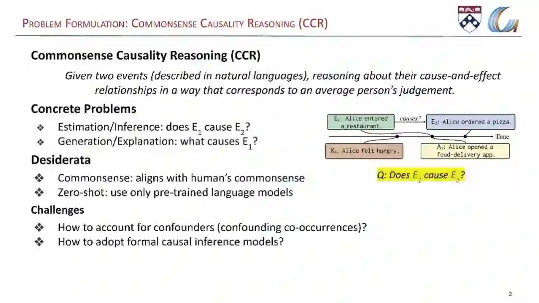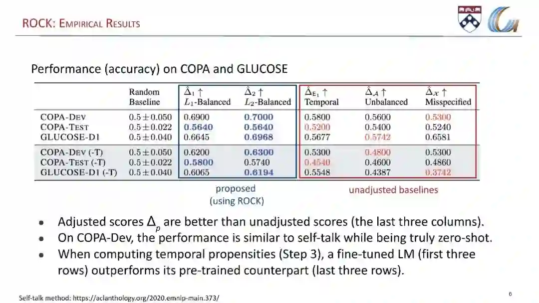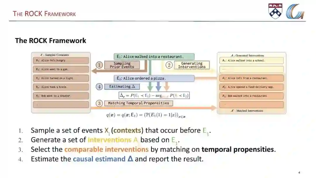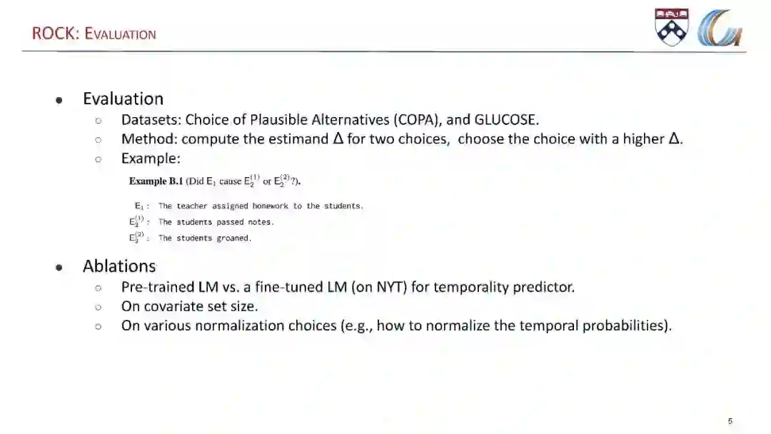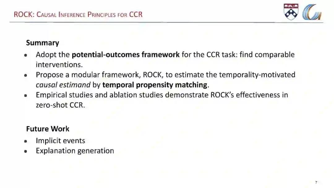 常识性因果推理(CCR)的目的是在自然语言描述中确定一般人认为合理的合理原因和结果。尽管这一问题具有很大的学术和实践兴趣,但它仍然被缺乏一个合适的理论框架所笼罩;现有的工作通常完全依赖于深度语言模型,并且可能容易混淆共现现象。在经典因果原理的推动下,我们阐明了CCR的核心问题,并将观察性研究中的人类受试者与自然语言进行比较,从而将CCR引入到潜在结果框架中,这是对常识性任务的首次尝试。我们提出了一个新的框架ROCK来推理常识K(C)相关性的O(a),它利用时间信号作为偶然监督,并使用类似于倾向评分的时间倾向来平衡混杂效应。ROCK的实现是模块化和零样本的,并展示了良好的CCR能力。
