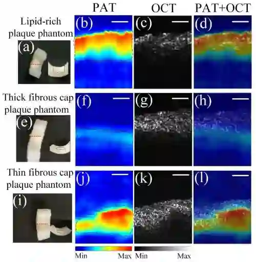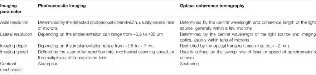 在2021年的最新报道中,研究者们认为PAI与OCT是合适的伴侣,并总结分析了十多年来,融合PAI和OCT成像的各种尝试,包括PAM-OCT、PAT-OCT和PAE-OCT。PAT-OCT具有明显的高穿透深度优势,因此在皮肤病学中具有巨大的潜力;相比于冠脉内的其他检测手段(Near-intrared spectroscopy,NIRS,近红外光谱),IV-PA能进一步识别脂质的空间位置和数量,因此其风险评估的意义更大。但是,PA成像的一个缺点是低吸收性生物组织的信息丢失,OCT则可在此方面进行补充,如下图8。
