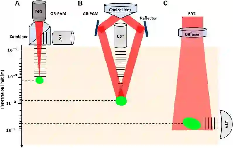 图2 不同模式PAI中的信号生成,和组织穿透限制。(A)OP-PAM(optical-resolution PAM)系统,具有光声组合器传输光和反射声;(B)AP-PAM(acoustic-resolution PAM)系统,带有散射的激光系统;(C)PAT系统,带有超声换能器(Ultrasonic transducer array,UTA),激光束通过散射器扩展和均匀化,以提供宽场照射