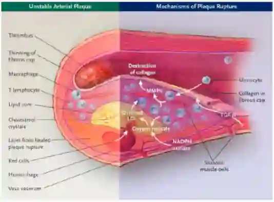 图5 动脉粥样硬化的发病和斑块破裂的机制。不稳定斑块有一个薄纤维帽,可能是由血栓形成的,其特征是存在许多炎症细胞和大的脂质核心。斑块中巨噬细胞和T淋巴细胞的积聚,使得基质金属蛋白酶(Matrix metalloproteinases,MMPs)释放,MMPs消化胶原蛋白并导致纤维帽变薄。此外,由于细胞外机制中脂质的积累,富含脂质的巨噬细胞死亡,以及血管滋养管斑块内出血后红细胞膜的积累,坏死的脂质核心不断增长(此处,脂质是PAI检测识别的重要内容)