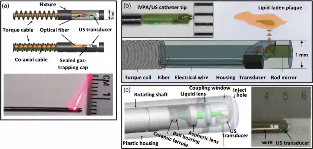 图3 通用的IV-PA导管头端设计示意图。(a)光纤;(b)透明的光学传输声镜;(c)环形换能器,实现光声对齐(从这张图即可看出,IV-PA本质上即是一种融合的多模态成像技术,因此,将其做细做小也是个很大的挑战)