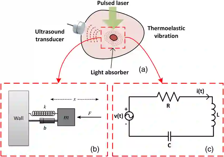 图1 (a)激光照射引起的光声效应示意图;(b)由F力驱动的等效质量阻尼振荡器模型;(c)等效电阻-电感-电容电路模型