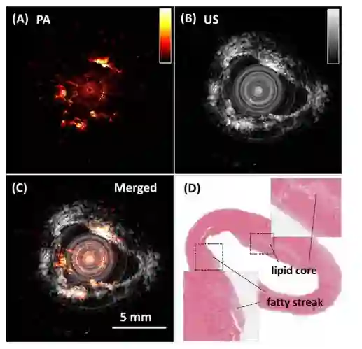 基于图像形成的方式,PAI可分为三大类:基于重建图像形成的光声断层扫描(Photoacoustic tomography,PAT),基于聚焦图像形成的光声显微镜(Photoacoustic microscopy,PAM),和光声内窥镜(Photoacoustic endoscopy,PAE)。基于导管的血管内光声成像(Intravascular photoaoustic,IV-PA)也为PAE的一种,由于动脉粥样硬化的脂质成分,普遍认为是斑块易损性的主要指标之一,因此IV-PA,包括基于脉冲的和基于低功率连续波(Continuous-wave,CW)的IV-PA,可作为一种有力的工具来检测斑块中的各类成分。(PAI的其他应用,譬如肿瘤学、眼科、胃肠学和皮肤学科的应用本次就不聊了)