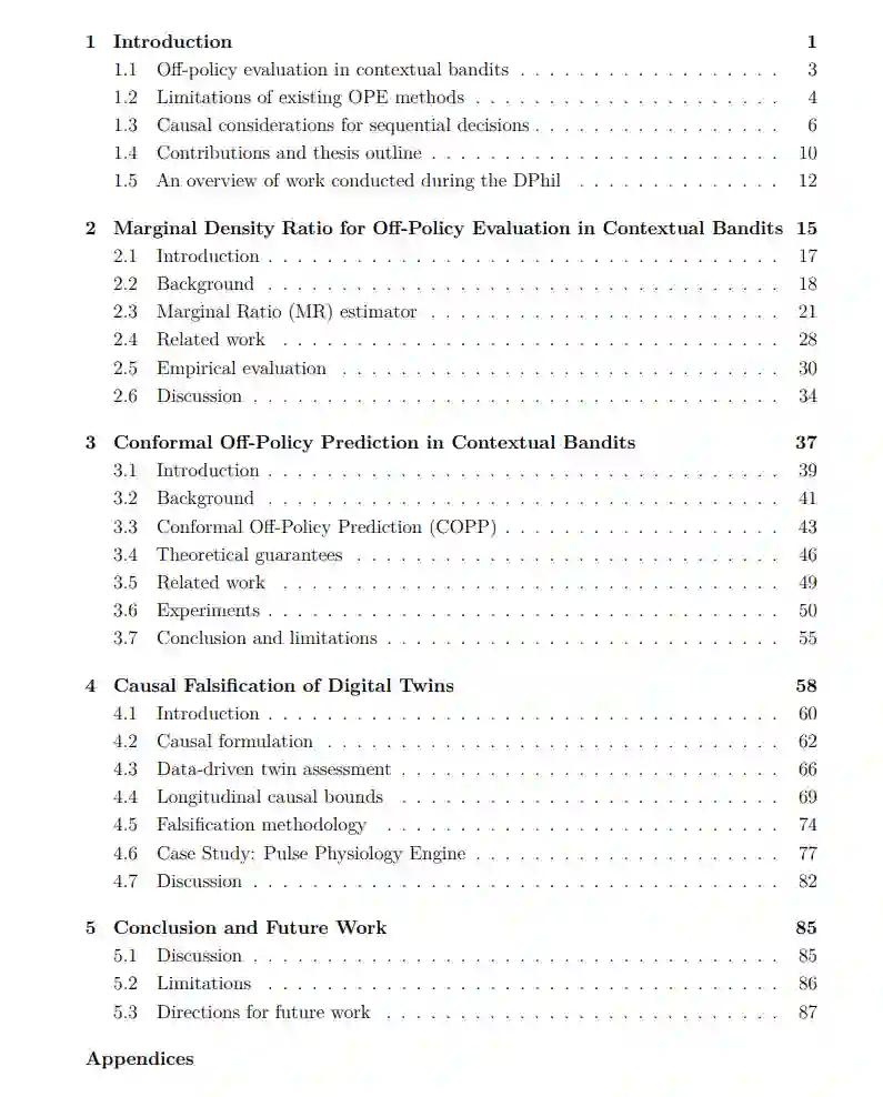 首先,我们关注基于重要性采样的OPE估计器中的高方差问题。我们提出了一种新的非策略评估估计器——边际比率(MR)估计器,以缓解这一问题。通过专注于结果的边际分布而非直接关注策略变化,MR估计器在保持无偏性的同时,显著降低了方差,优于现有方法。 接下来,我们将注意力转向非策略评估中的不确定性量化。为此,我们提出了**保形非策略预测(COPP)**作为一种新方法,以在有限样本条件下量化这种不确定性并提供保证。与传统方法关注期望结果的点估计不同,COPP为目标策略下的结果提供了可靠的预测区间。这使得在风险敏感的应用中能够实现稳健的决策,并为策略性能提供了更全面的理解。 最后,我们解决了非策略评估中因果推断的根本挑战。认识到传统OPE方法在未测量混杂因素下的局限性,我们开发了适用于序列决策设置的新型因果界限,这些界限在任意混杂条件下仍然有效。我们将这些界限应用于数字孪生模型的评估,而不依赖于强因果假设。我们提出了一个因果证伪框架,使我们能够识别数字孪生预测与现实行为不一致的场景。这种方法为模型可靠性提供了有价值的见解,并有助于确保安全有效的决策。 在论文的结尾,我们讨论了本研究的贡献和局限性,并提出了未来研究的有趣方向。