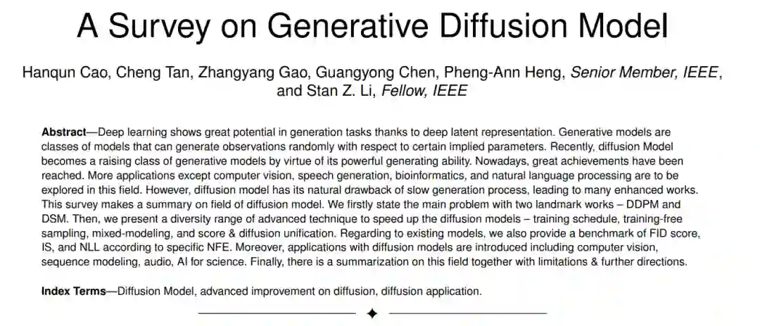 A Survey on Generative Diffusion Model Hanqun Cao, Cheng Tan, Zhangyang Gao, Guangyong Chen, Pheng-Ann Heng, Senior Member, IEEE, and Stan Z. Li, Fellow, IEEE 由于深度潜在表示,深度学习在生成任务中显示出巨大的潜力。生成模型是一类可以根据某些隐含参数随机生成观察结果的模型。近年来,扩散模型以其强大的生成能力成为生成模型的一个新兴门类。如今,已经取得了巨大的成就。除了计算机视觉、语音生成、生物信息学和自然语言处理外,该领域还将探索更多的应用。然而,扩散模型有其生成过程缓慢的天然缺陷,导致许多改进的工作。本文对扩散模型的研究领域进行了综述。我们首先阐述两项标志性工作的主要问题,DDPM及DSM。然后,我们提出了一系列先进的技术来加速扩散模型——训练计划、无训练采样、混合建模以及得分与扩散的统一。对于现有的模型,我们还根据具体的NFE提供了FID score, IS, NLL的基准。此外,还介绍了扩散模型的应用,包括计算机视觉、序列建模、音频、科学人工智能等。最后,对该领域的研究现状进行了总结,指出了研究的局限性和进一步的研究方向。 https://www.zhuanzhi.ai/paper/1fee483da0347749193cb9e6848254cc ** **