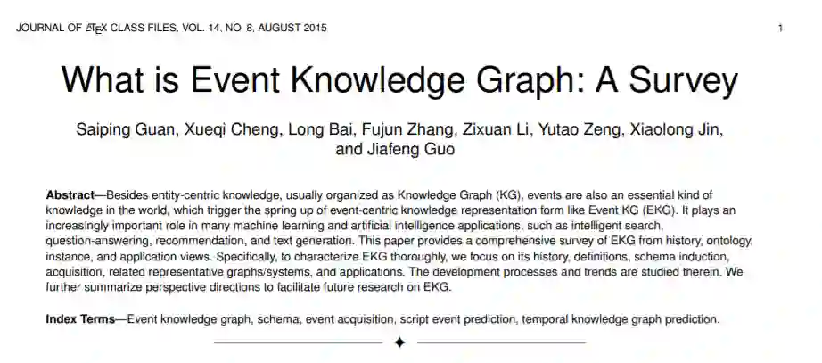 除了以实体为中心的知识(通常以知识图谱(knowledge Graph, KG)的形式组织起来),事件也是世界上必不可少的一种知识,它引发了以事件为中心的知识表示形式(Event KG, EKG)的兴起。它在许多机器学习和人工智能应用中发挥着越来越重要的作用,如智能搜索、问题回答、推荐和文本生成。**本文从历史、本体、实例和应用视图等方面对EKG进行了全面的综述。**为了更全面地描述EKG,我们将重点关注它的历史、定义、模式归纳、获取、相关的代表性图形/系统和应用程序。研究了其发展过程和趋势。我们进一步总结了未来EKG研究的发展方向。