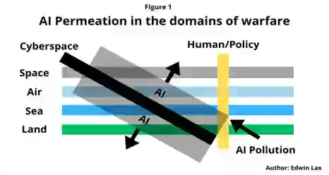 本文提出了对人工智能的新理解,即人工智能是源于网络空间领域的战争领域的整合者。在这一扩展过程中,人工智能越来越多地与人类因素互动,导致人工智能污染现象成为日益相关的安全威胁。结论是,缺乏一种旨在均衡整合各国不同的军事条令和人类动态,以及不同模型之间不同的人工智能逻辑的整体方法,在军事行动日益缺乏灵活性方面发挥了重要作用。这反过来又增加了军事进程的脆弱性,影响了防御和力量投射能力。因此,当务之急是制定战略,考虑人工智能带来的错综复杂的动态变化,以保持军事和国防结构的稳健性和适应性。理解和实施这种综合方法对于未来的军事效率和国家安全至关重要。