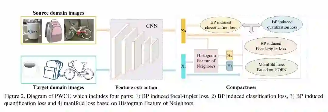 摘要:域自适应图像检索包括单域检索和跨域检索。现有的图像检索方法大多只关注单个域的检索,假设检索数据库和查询的分布是相似的。然而,在实际应用中,通常在理想光照/姿态/背景/摄像机条件下获取的检索数据库与在非受控条件下获得的查询之间的差异很大。本文从实际应用的角度出发,重点研究跨域检索的挑战性问题。针对这一问题,我们提出了一种有效的概率加权紧凑特征学习(PWCF)方法,它提供域间相关性指导以提高跨域检索的精度,并学习一系列紧凑二进制码(compact binary codes)来提高检索速度。首先,我们通过最大后验估计(MAP)推导出我们的损失函数:贝叶斯(BP)诱发的focal-triplet损失、BP诱发的quantization损失和BP诱发的分类损失。其次,我们提出了一个通用的域间复合结构来探索域间的潜在相关性。考虑到原始特征表示因域间差异而存在偏差,复合结构难以构造。因此,我们从样本统计的角度提出了一种新的特征—邻域直方图特征(HFON)。在不同的基准数据库上进行了大量的实验,验证了我们的方法在领域自适应图像检索中的性能优于许多最先进的图像检索方法。