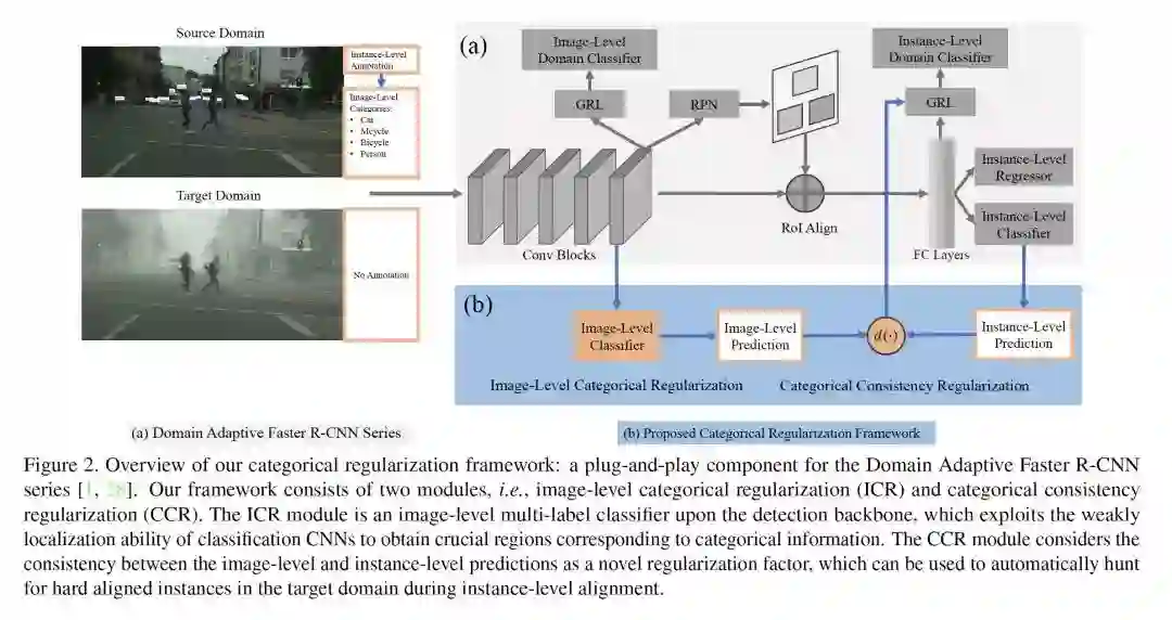 摘要:在本文中,我们解决了域自适应目标检测问题,其中的主要挑战在于源域和目标域之间存在明显的域差距。以前的工作试图明确地对齐图像级和实例级的移位,以最小化域差异。然而,它们仍然忽略了去匹配关键图像区域和重要的跨域实例,这将严重影响域偏移缓解。在这项工作中,我们提出了一个简单有效的分类正则化框架来缓解这个问题。它可以作为一个即插即用(plug-and-play)组件应用于一系列域自适应Faster R-CNN方法,这些方法在处理域自适应检测方面表现突出。具体地说,由于分类方式的定位能力较弱,通过在检测主干上集成图像级多标签分类器,可以获得与分类信息相对应的稀疏但关键的图像区域。同时,在实例级,我们利用图像级预测(分类器)和实例级预测(检测头)之间的分类一致性作为正则化因子,自动寻找目标域的硬对齐实例。各种域转移场景的大量实验表明,与原有的域自适应Faster R-CNN检测器相比,我们的方法获得了显着的性能提升。此外,定性的可视化和分析可以证明我们的方法能够关注针对领域适配的关键区域/实例。