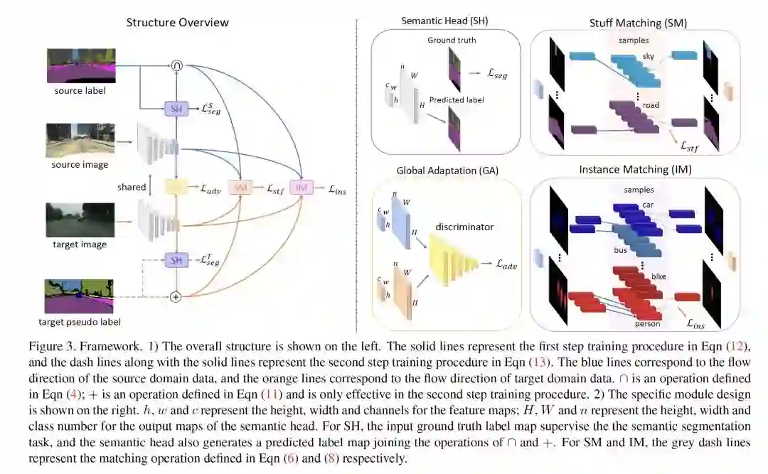 摘要:本文通过缓解源域(合成数据)和目标域(真实数据)之间的域转换(domain shift),研究语义分割中的无监督域自适应问题。之前的方法证明,执行语义级对齐有助于解决域转换问题。我们观察到事物类别通常在不同域的图像之间具有相似的外观,而事物(即目标实例)具有更大的差异,我们提出使用针对填充(stuff)区域和事物的不同策略来改进语义级别的对齐方式:1)对于填充类别,我们为每一类生成特征表示,并进行从目标域到源域的对齐操作;2)对于事物(thing)类别,我们为每个单独的实例生成特征表示,并鼓励目标域中的实例与源域中最相似的实例对齐。以这种方式,事物类别内的个体差异也将被考虑,以减轻过度校准。除了我们提出的方法之外,我们还进一步揭示了当前对抗损失在最小化分布差异方面经常不稳定的原因,并表明我们的方法可以通过最小化源域和目标域之间最相似的内容和实例特征来帮助缓解这个问题。