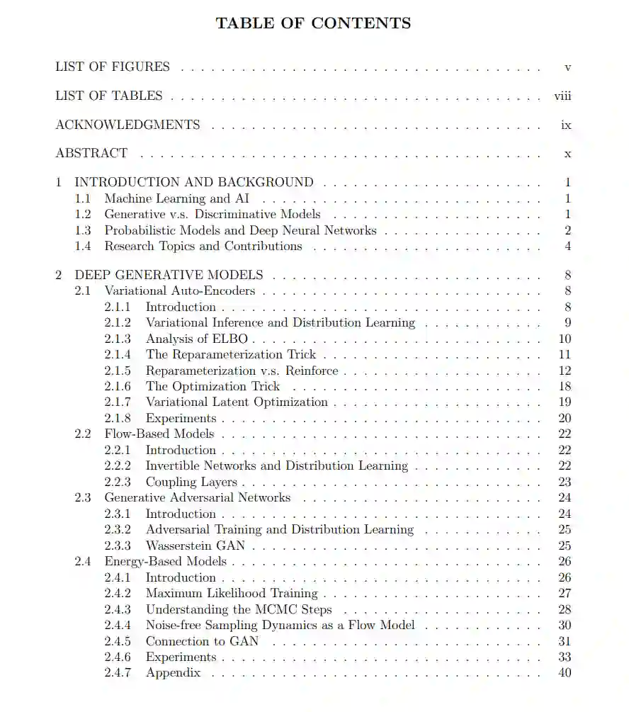 首先,我们介绍了不同DGM的基本原理,包括变分自动编码器(VAE)、基于流的模型、生成对抗网络(GAN)和基于能量的模型(EBM)。我们还提出了VAE的新对应物:变分潜在优化(VLO),它不需要编码器结构。此外,我们提供了一种新的角度来理解EBM的生成过程,建立了EBM和GAN之间的联系,并设计了一种新方法来提高EBM样本质量。