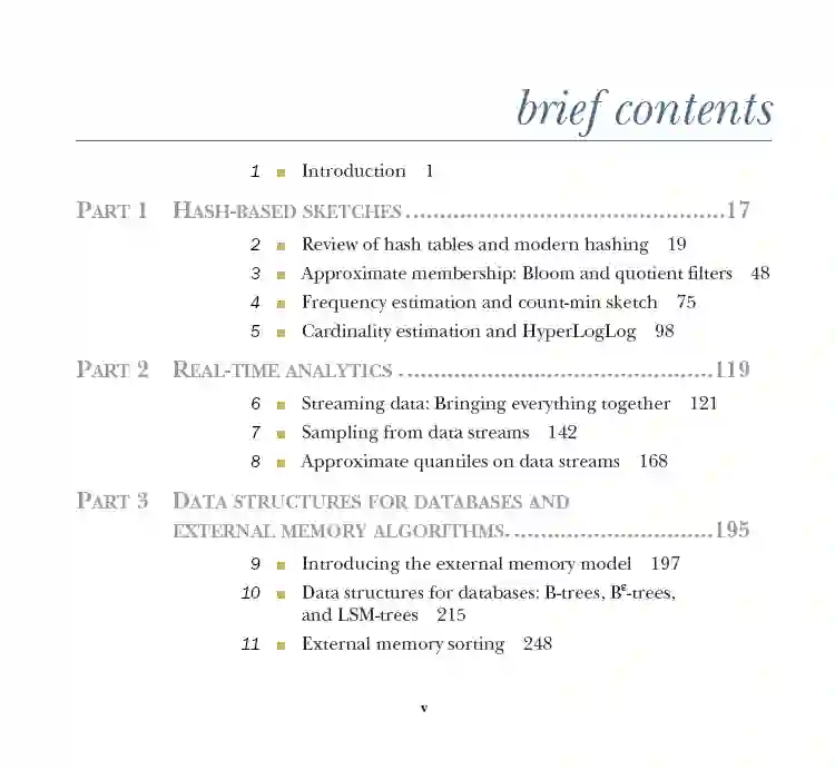 本书共分三个部分,共11章。第1部分是关于概率的简洁数据结构,第2部分是关于流数据结构和算法,第3部分是关于外部内存数据结构和算法。以下是每一章的简要总结: