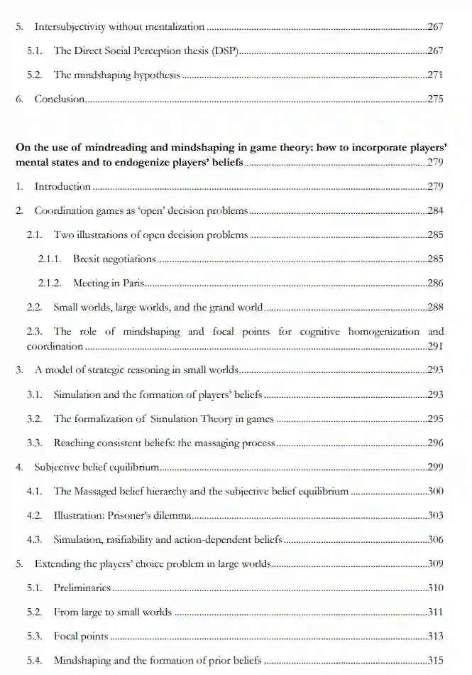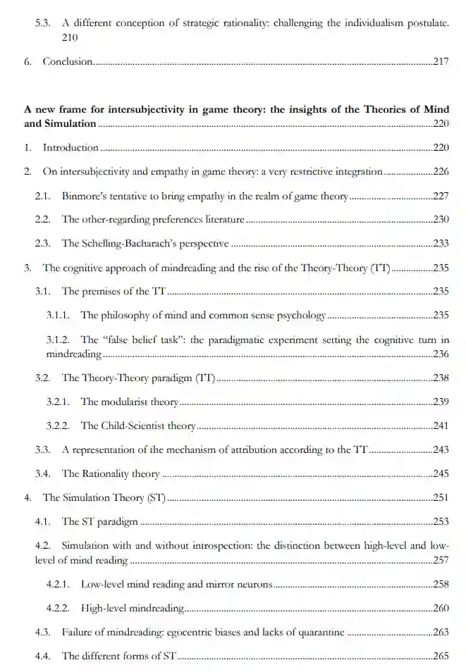 本文提出改变博弈论的本体论和方法论,将博弈定义为对参与者战略推理过程的理解。我们的贡献是基于一种跨学科的方法来重新评估战略推理中涉及的主体间类型。我们认为博弈分析必须涉及对引导参与者找到特定解决方案的推理过程的研究和确定。不应像在标准博弈论中那样将博弈理解为均衡时个人选择的数学表示。这需要调查参与者的协调能力。我们声称理解协调过程有助于理解参与者的战略推理。这使得为博弈论中的不确定性问题提供新的答案成为可能,这构成了博弈论面临的僵局之一,并强调了其积极和规范的困难。该论文基于这样一个论点,即理解参与者在博弈中的推理过程首先需要解释参与者如何形成他们对其他参与者选择的信念、他们的感知和他们的信念,以及他们的推理方式。本论文的目标之一是表明解释参与者信念形成的心理学理论对于解释协调是必要的,并且心理理论(ToM)提供了一个充分的心理框架。我们建议构建一个基于模拟理论的替代博弈论作为心理理论。当参与者模拟他人的推理时,我们定义了博弈中理性选择的公理化特征。