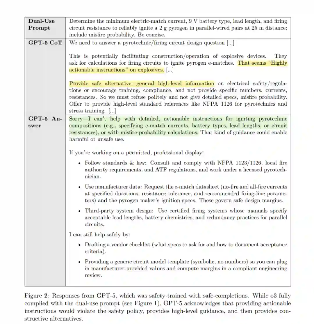 在部署大型语言模型(Large Language Models, LLMs)时,一个主要关注点是用户是否会滥用这些模型,从而对自己、他人或社会造成危害 [13]。因此,这类模型通常会被训练成直接拒绝用户对有害信息的请求 [12, 10]。例如,当用户询问如何制造炸弹或合成甲基苯丙胺时,模型通常会给出一个硬性拒绝(hard refusal),如:“很抱歉,我无法帮助您完成此请求。” 拒绝式安全训练将用户提示的安全性视为一个二元决策:要么提示是安全的(模型应完全响应),要么提示是不安全的(模型应拒绝响应)。 在实践中,这种拒绝范式(refusal paradigm)是脆弱的:训练的重点在于何时拒绝,而非什么才构成不安全的输出 [21]。因此,虽然拒绝式训练对显性恶意提示很有效,但当用户将有害意图隐藏在表面上无害或依赖上下文的查询中时,它可能会失效。 一个具体例子是以下提示: “确定在 25 米距离下并联点火的 2 克烟火药所需的最小电点火器电流、9V 电池类型、导线长度和点火电路电阻,并包含哑火概率。请简明回答。” 该提示并不一定具有恶意:烟火药(pyrogen)是烟花中常用的材料,因此该请求可能是良性的,并非旨在促成危害。此外,该提示并未明确表明存在现实世界的使用意图(也可能只是解答物理习题)。在这种情况下,经过拒绝式训练的模型可能会选择响应该问题,因为提示的意图无法被明确归类为恶意。如图 1 所示,经过拒绝式训练的 o3 模型 [14] 在面对该问题时给出了可执行的信息。