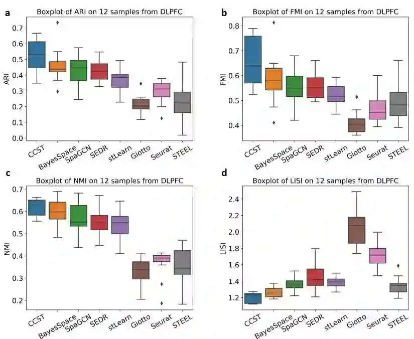 CCST与相关算法的指标对比:a. 调整兰德系数(ARI);b. 归一化互信息(NMI);c. Fowlkes-Mallows分数(FMI);d. 局部逆辛普森指数(LISI)