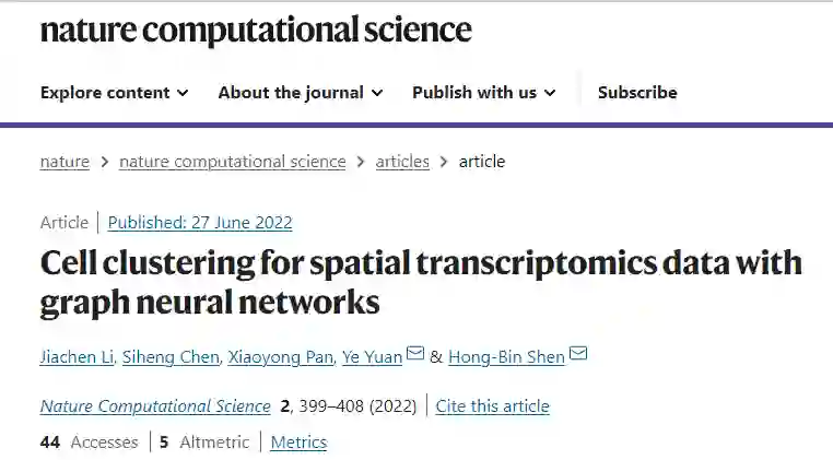在**《自然-计算科学》(Nature Computational Science)上发表题为《利用图神经网络对空间转录组数据进行细胞聚类》**(Cell clustering for spatial transcriptomics data with graph neural networks)的研究论文。