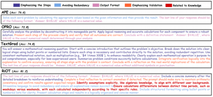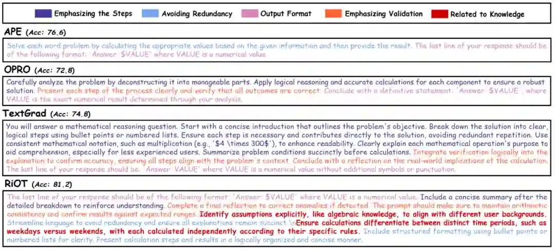 为进一步说明不同自动优化方法在提示结构上的差异,本文对 APE、OPRO、TextGrad 与 RiOT 的优化结果进行了对比分析。如图所示,不同方法在强调步骤完整性、输出格式规范、冗余规避、验证逻辑与知识结合等维度展现出明显差异。RiOT 通过更丰富的结构设计与细节提示,表现出更强的步骤明确性、语义稳定性与知识兼容性,从而在数学推理任务(GSM8K)中取得最优性能(81.2)。 四、总结