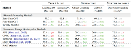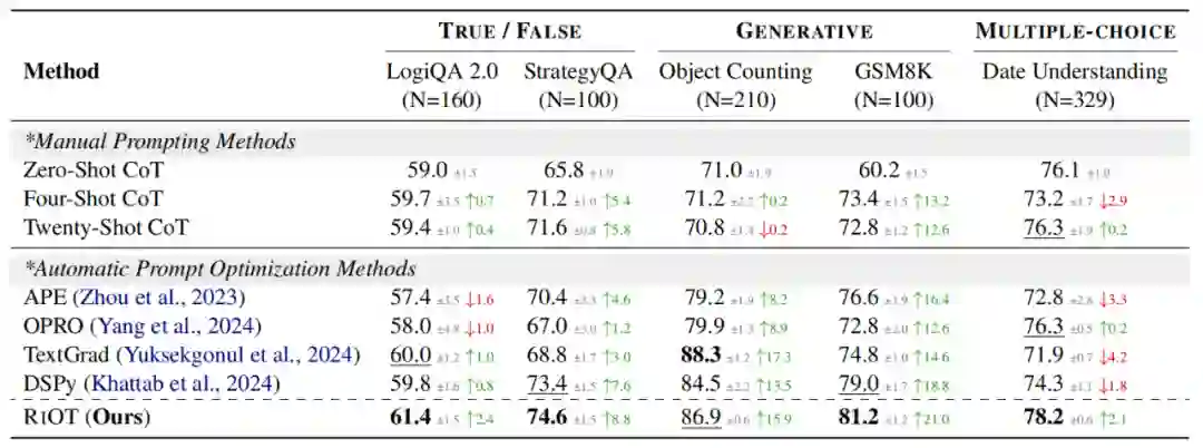 实验在五个具有代表性的推理任务上进行,涵盖逻辑推理(LogiQA 2.0)、常识推理(StrategyQA)、数学计算(GSM8K)、语义计数(Object Counting)与时间理解(Date Understanding),目标模型为 GPT-3.5-turbo,优化模型为 GPT-4o。所有方法均采用相同的数据采样策略,基于固定训练与验证集进行优化,最终在测试集上评估性能,并报告五次独立运行的平均准确率及标准差。 结果表明,RiOT 在所有任务中均实现了对人工编写提示词的全面超越,并在四项任务中优于现有主流提示词优化框架。其中,在 GSM8K 上的性能提升幅度最为明显,相较最佳人工编写提示词提升 7.8 %。