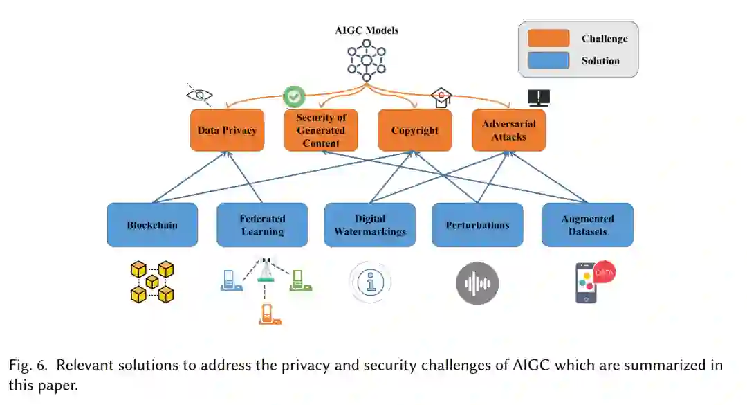 人工智能生成内容(AIGC)是人工智能发展的最新成果之一。相关应用生成的内容,如文本、图像和音频,已经引发了热烈的讨论。各种衍生的AIGC应用也逐渐进入了生活的各个领域,对人们的日常生活带来了难以想象的影响。然而,这种生成工具的快速发展也引发了对AIGC中的隐私和安全问题,甚至是版权问题的关注。我们注意到,像区块链和隐私计算这样的先进技术可以与AIGC工具结合,但是还没有工作去系统化和详细地研究他们的相关性和前景。因此,有必要通过充分探索上述技术,研究它们如何用于保护AIGC中数据的隐私和安全。在这篇论文中,我们首先系统地回顾了AIGC的概念、分类和底层技术。然后,我们从多个角度讨论了AIGC面临的隐私和安全挑战,并有针对性地列出了目前存在的对策。我们希望我们的综述能帮助研究人员和行业建立一个更安全、更稳健的AIGC系统。