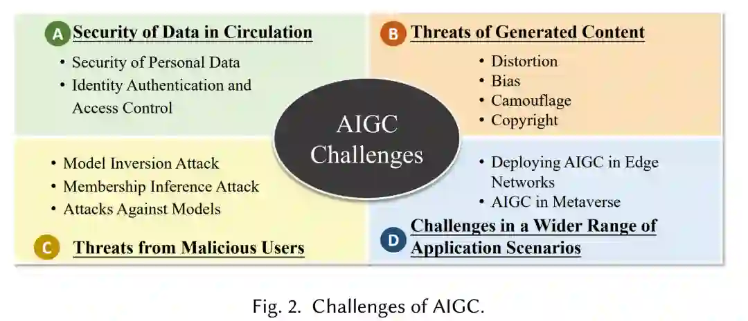 尽管AIGC模型因其强大的内容生成能力和效率而引起了全世界的关注,但对于其实际的大规模使用仍然存在担忧,即,使用AIGC服务可能会引发安全性或隐私问题。可能来自AIGC的问题包括:用户的输入数据泄漏、模型攻击、数据爬取和生成内容的不安全性。